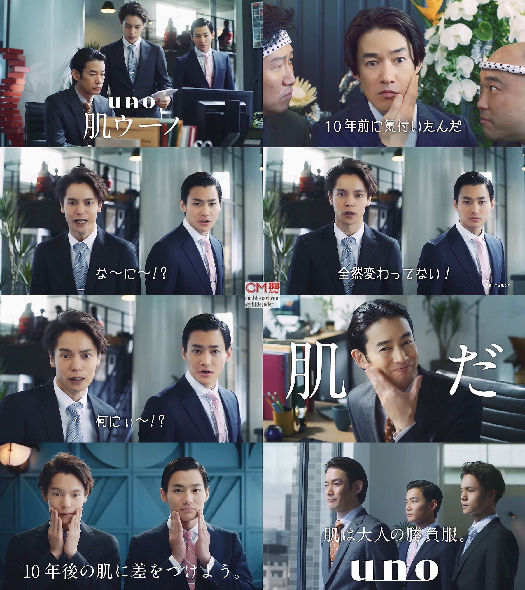 サラリーマン役の俳優の窪田正孝さんと野村周平さんが、上司の竹野内豊さんに「お願いします」と書類を手にやってきてデスクの昔の竹野内豊さんの写真を見て「これいつの写真ですか?」と問うと、「10年前だ」と言うので、「なーにー?」「全然変わってない?」と驚き、「10年前に気づいたんだ」と言うので、「何にー?」と再び問うと、「肌だ」と笑顔で答えます。