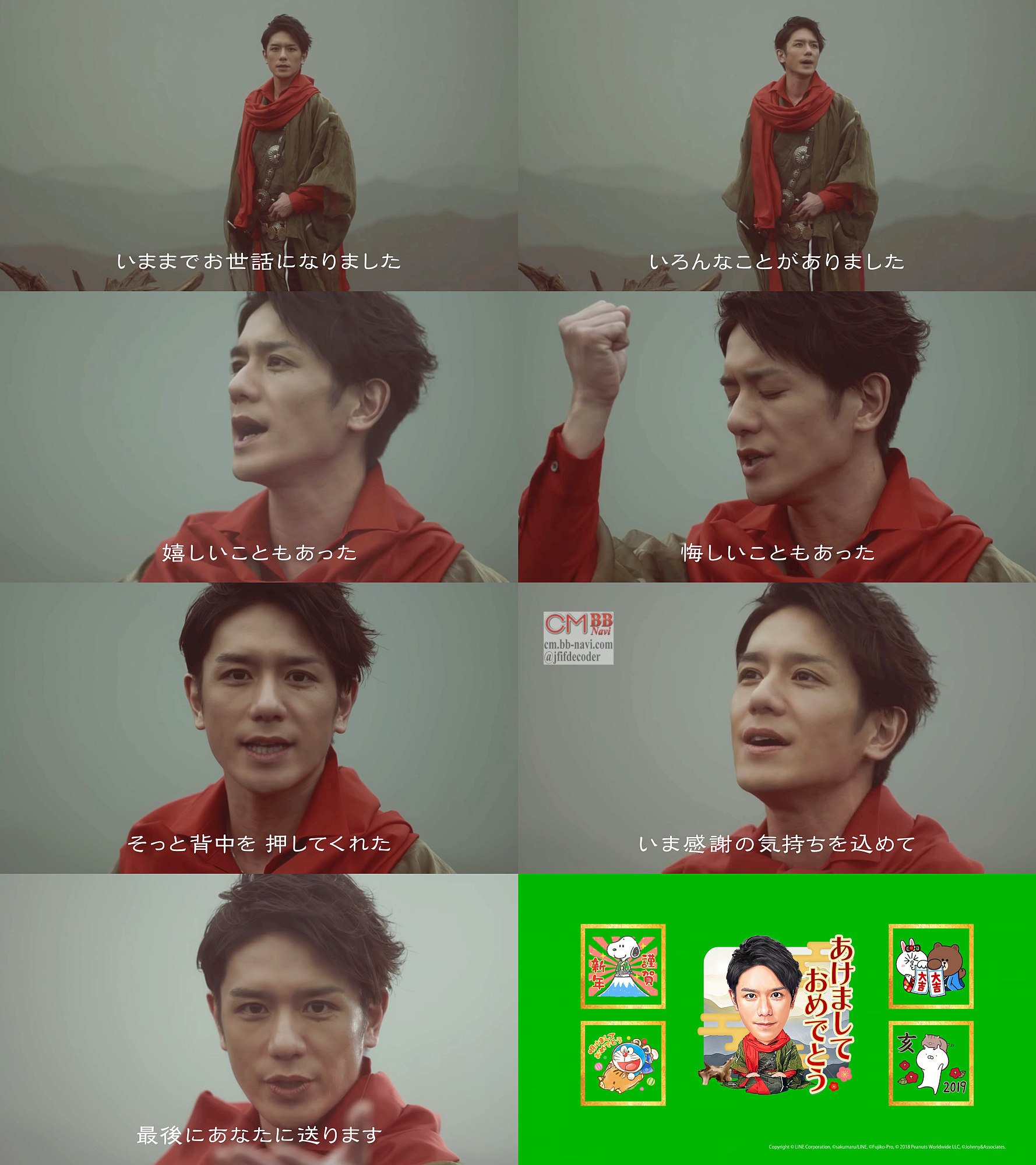 俳優の滝沢秀明さんが「いままでお世話にな〜り〜ました♪色んな事が〜あ〜り〜ました〜♪嬉しい事もあった、悔しい事もあった〜♪ どんな時もあなたがいて〜♪ そっと背中を押してくれた〜♪ だから〜踏み出せました♪」と歌い、顔アップで「今、感謝の〜気持ちを込めて〜♪ 最後にあなたに贈ります」と続け、最後に「ラインおみくじ〜 ラインおみくじ〜♪」と繰り返し歌います。