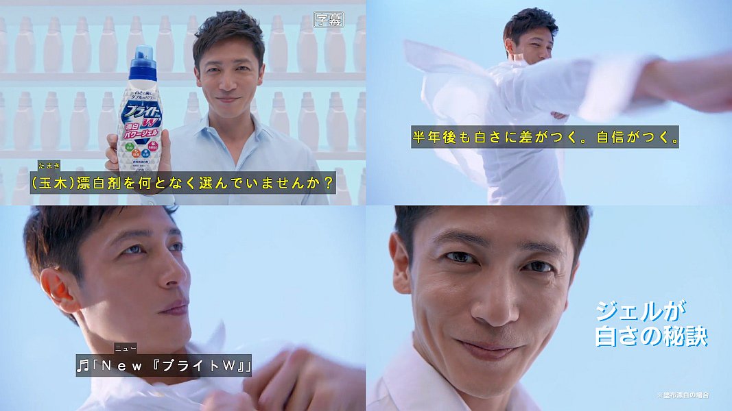 「漂白剤をなんとなく、選んでいませんか?」と登場した俳優の玉木宏 さんが、白いシャツの上に白のワイシャツをアップでシュッと着て「ジェルが白さの秘訣」と言う、ブライトWのCM字幕入バージョンです。