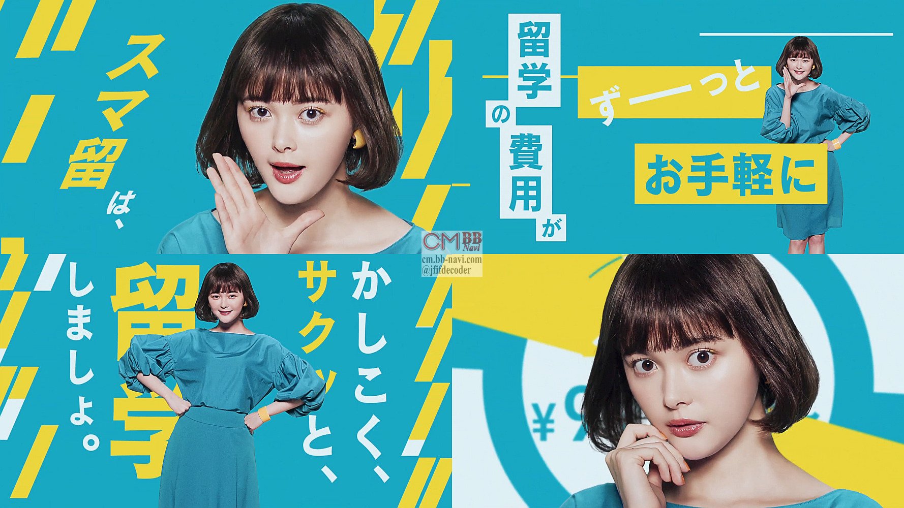 ミントブルーのワンピース姿の女優の玉城ティナさんが「スマ留は、留学の費用がずーっとお手軽に」と登場し、カナダ留学の例が紹介され、再び玉城ティナさんが顔アップで「アリじゃない?」「賢く、サクッと、留学しましょ」と言うスマ留のCMです。