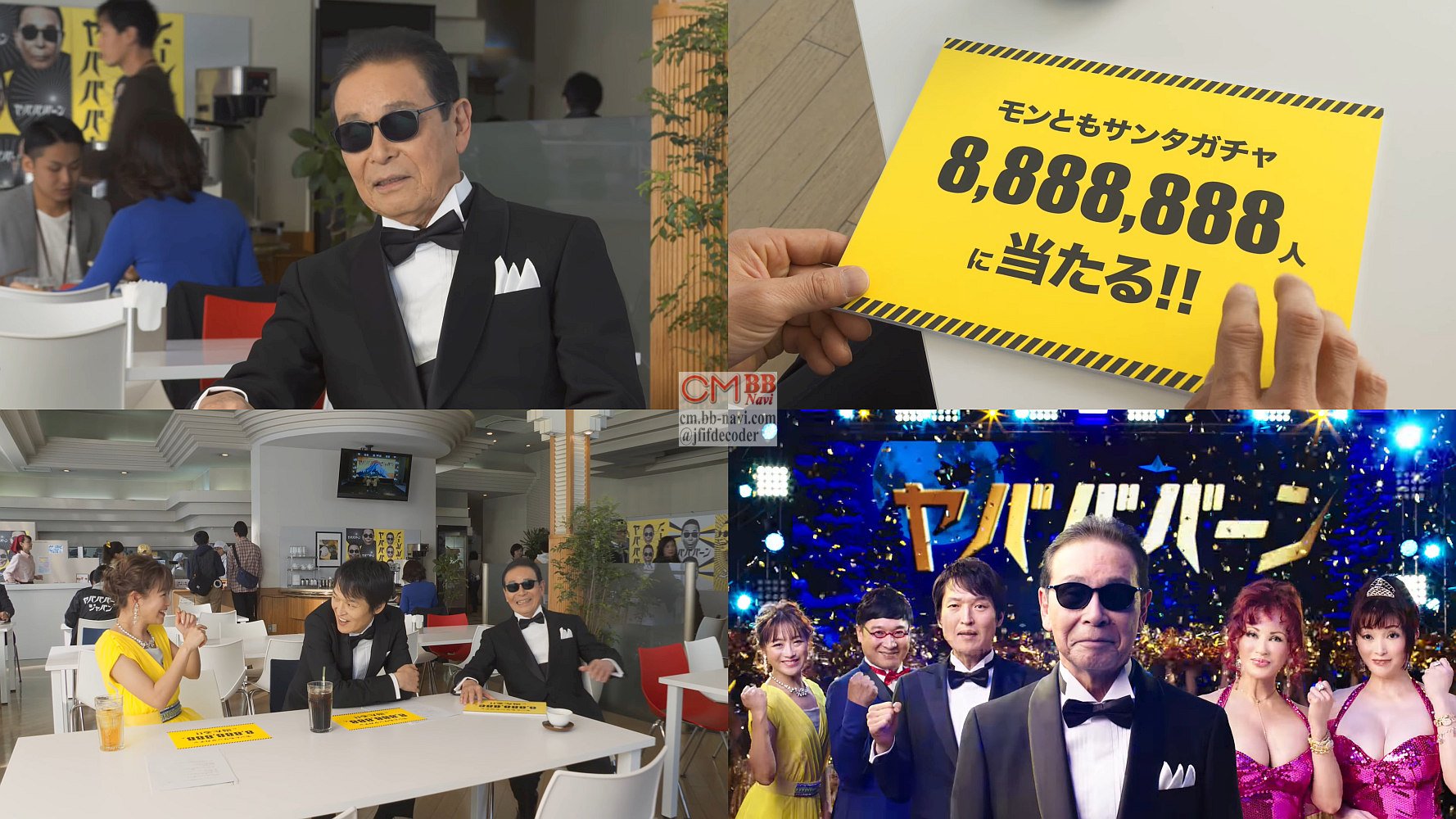 タキシードを着たタレントのタモリさんが”サンタガチャ 8888888人に当たる”と書かれた紙を見て「これ、幾らクリスマスって言ったってさぁ、当たりすぎじゃないの?」と言うと、鈴木奈々さんが「日本の人口超えてますよね」と言うので、タモリさんと千原ジュニアが「越えて無いよ」「だいぶヤバババーンやな」とツッコミ、「茨城の人口超えてますよね」と言うので、タモリさんが「それはわかんない」と答えるモンスターストライクの 年末年始もヤバババーン クリスマス篇のCMです。