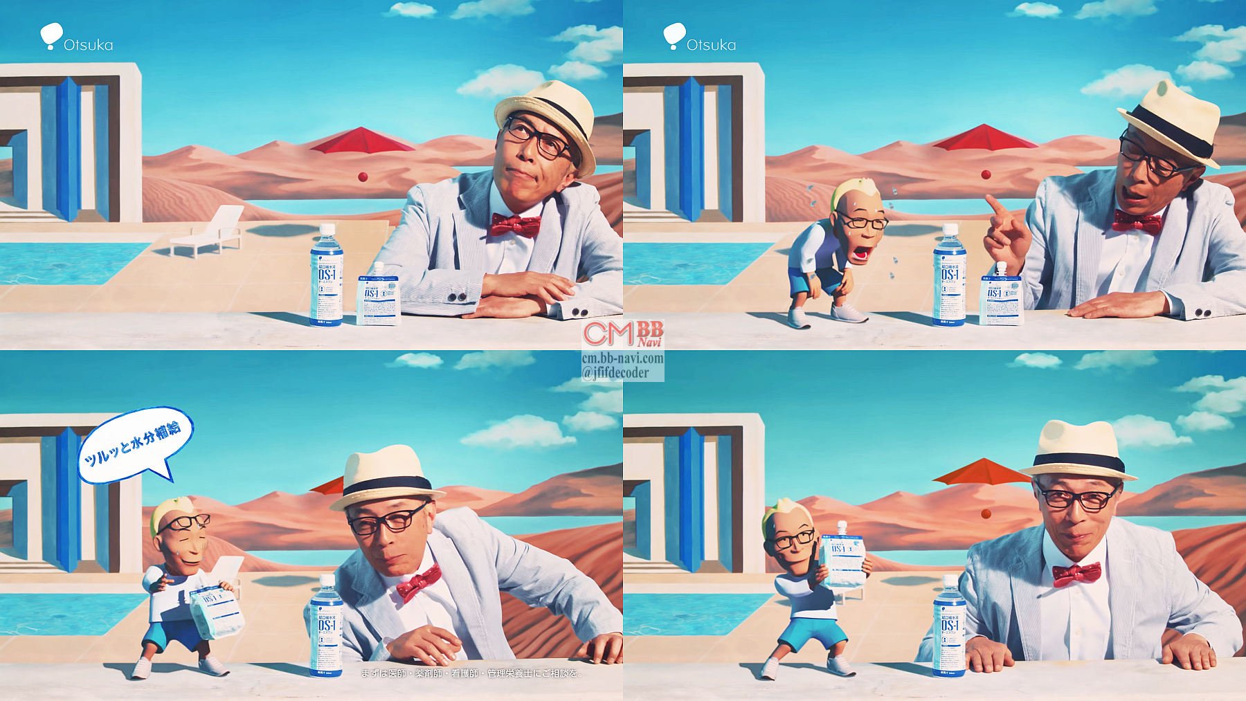 中折れ麦わら帽子に蝶ネクタイ姿の所ジョージさんが、脱水状態の所ジョージさんのミニチュアのような人形に「味で躊躇ってた人、ゼリーがいいのよ」と渡すと「ツルッと水分補給」「飲みやすい」と飲んで、子供達のナレーションで「経口補水液OS-1ゼリー」と言うCM ボトル変更改訂版です。