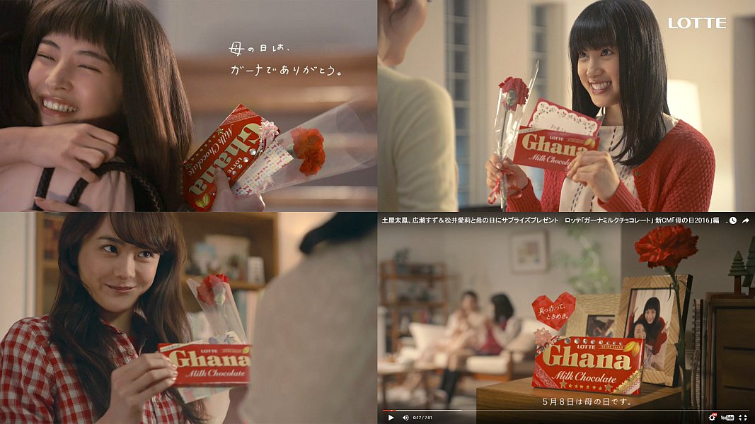 女優の、広瀬すずさん,松井愛莉さん,土屋太鳳さんの3人が、それぞれ、母の日にカーネーションとチョコとメッセージを母親に手渡し、頭をポンポンされたり、ハグされたりするCMです。