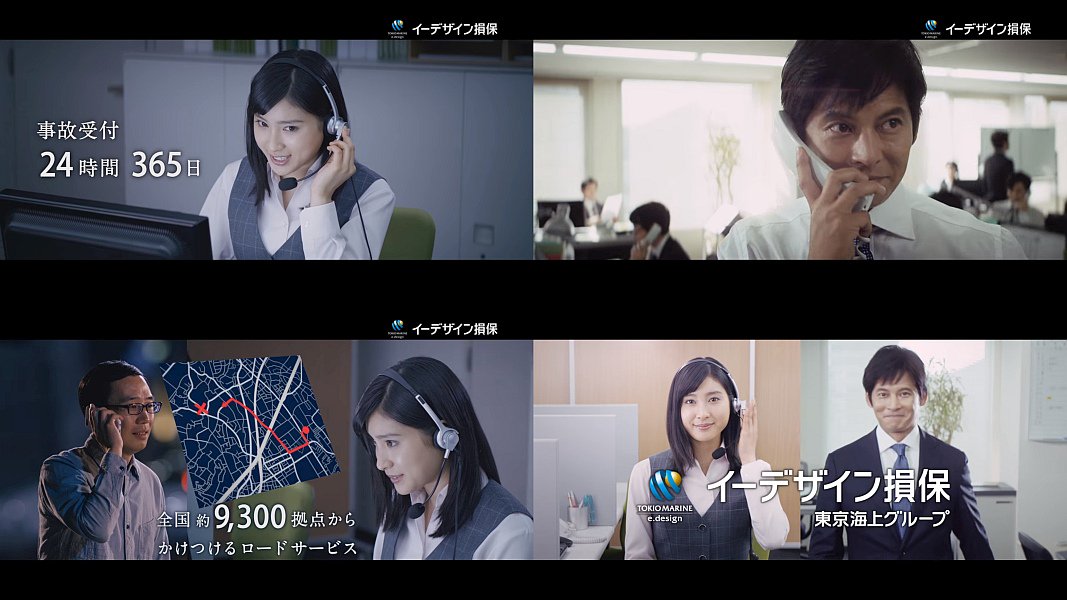 事故受付担当の安西優実役を演じる女優の土屋太鳳さんが自動車事故をした男性からの車が動かないと聞き、「レッカー車を手配致します」と答え、専任担当の真島誠司役の俳優の織田裕二さんが「あとはお任せ下さい」と答え、「僕らは動く。解決に向かって。示談交渉が終わるまで」と語る、イーデザイン損保のCMです。