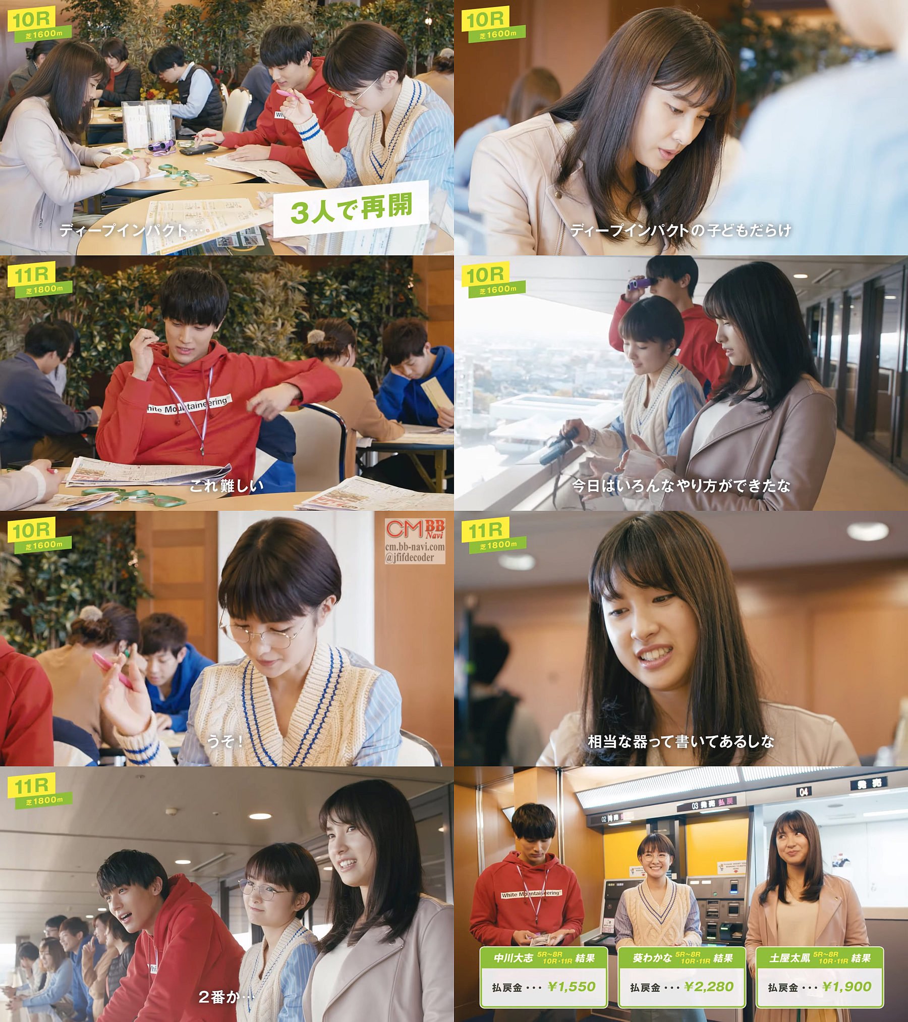 JRAのCMに出演中の女優の土屋太鳳さん葵わかなさん,俳優の中川大志さんの3人が実際に馬券を買ってレースを興奮気味に観戦する映像を使った、JRAの多分ウェブ限定の長編CM(PR) Vol6