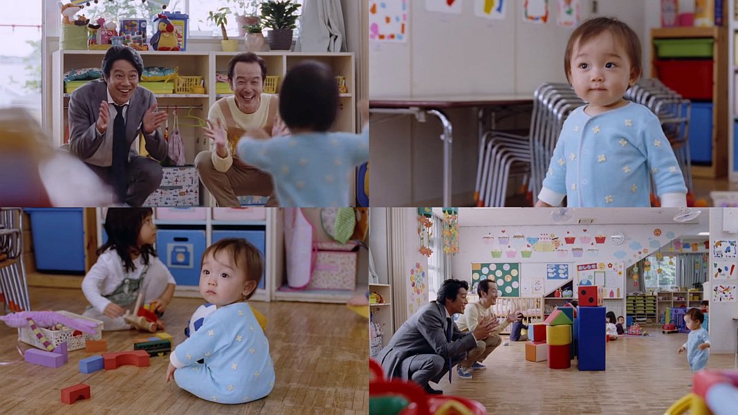 保育園にまだ幼い幼児の息子を迎えに来た父役の俳優の堤真一さんが、先生役のリリー・フランキーさんと一緒に手を叩きながら「トントントントン、ヒノノニトン」と言うと、よちよち歩きの息子が歩いてきて、ブロックが倒れたので、息子が「危険を察知」と止まり、堤真一さんが「うーわ、喋った」と驚く、日野デュトロのCMです。