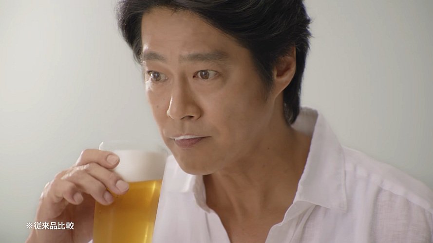 俳優の堤真一さんが、新しい一番搾りと飲み比べで、見比べて何も変わらないので「どう違う?どう違う?」と一口飲むと「味違う」「全然違う」と目を丸くして驚く、キリン一番搾りのCMです。