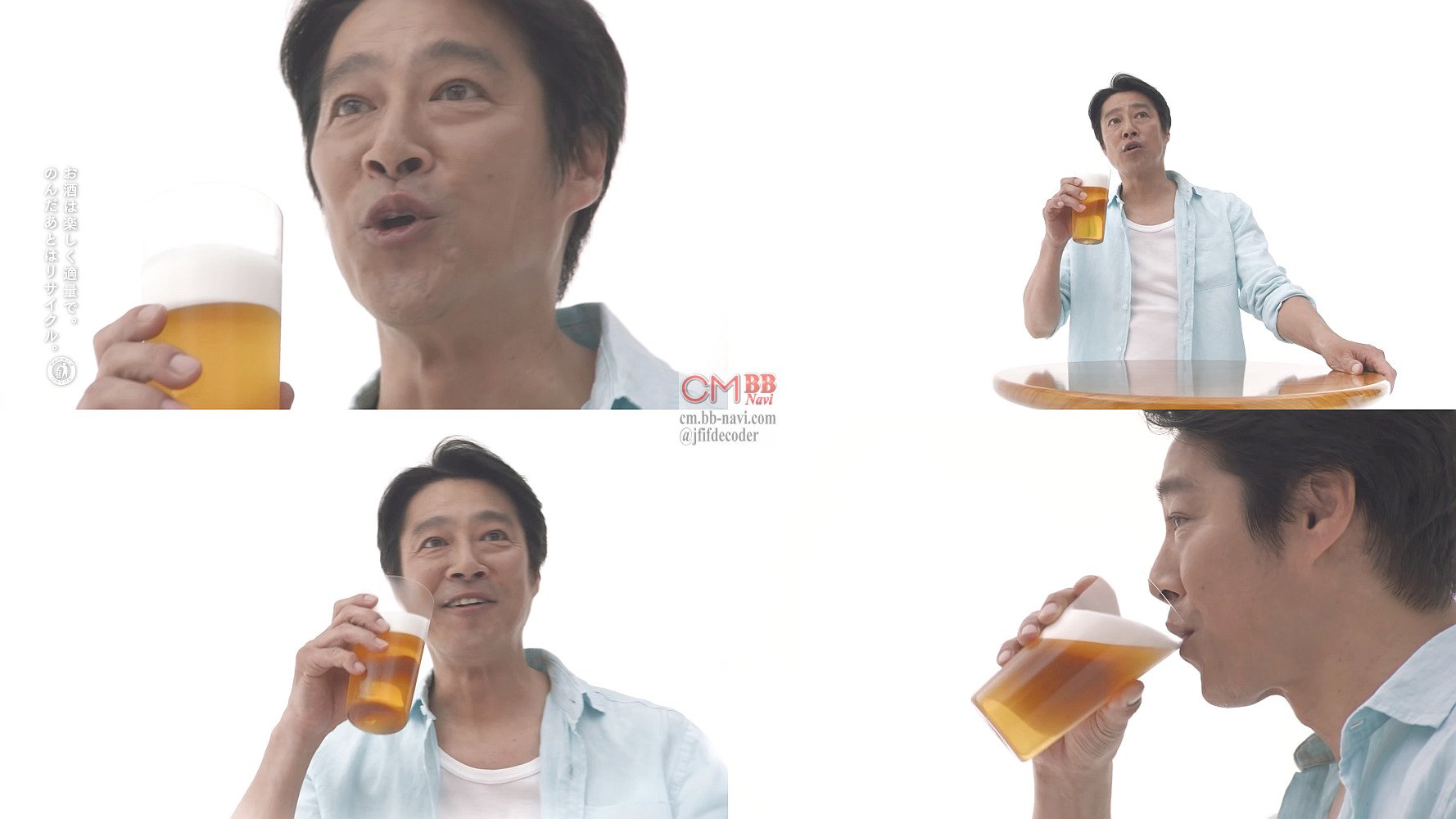 淡い水色のシャツをラフに着た俳優の堤真一さんが、何のビールか知らないグラスを一口飲み「濃いねぇ 後味は一番搾り」と言って「おいしいわ」と言う、一番搾り超芳醇のCM 改訂版(別バージョン)です。