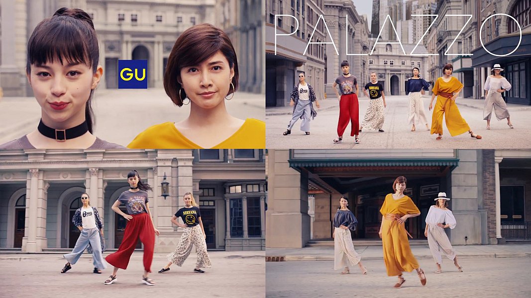 パラッツォパンツをはいた女優の中条あやみさんと内田有紀さんが、スキャットマン・ジョンの”Scatman”の替え歌のCM曲の「パーパッパッ パラッツォ パッパッ パラッツォ ♪」にメロディーにあわせて踊る、GU(ジーユー)のCMです。
