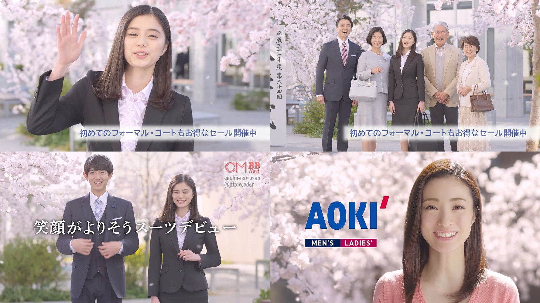 両親と一緒に訪れたAOKIで初めてのスーツを買った兄役の男性が、今度は入学式の記念写真で母が腕を組んで記念撮影を撮り、女優の紺野彩夏さんも入学式で「お母さん、一緒に撮ろうよ」と家族一緒で記念写真を撮り、最後に女優の上戸彩さんが、「スーツデビューおめでとう」と言う長編CMです。