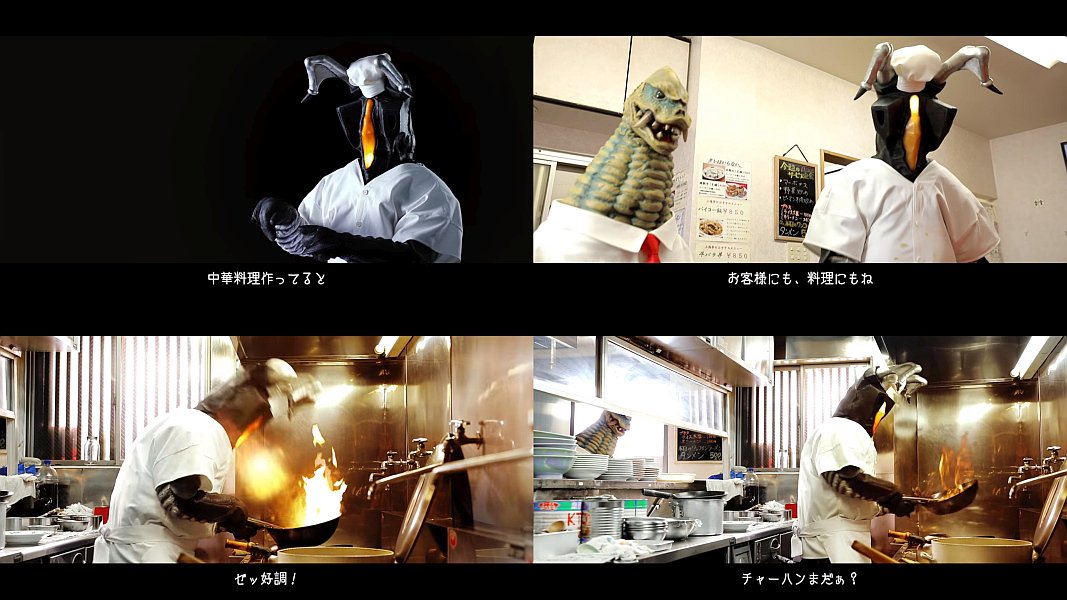 服についた油の汚れが気になる中華料理屋で働く宇宙恐竜ゼットンさんが、東芝のウルトラファインバブル洗浄搭載洗濯機ZABOONでシャツが真っ白に洗いあがって悩みが解決する、東芝の多分ウェブ限定のCMです。