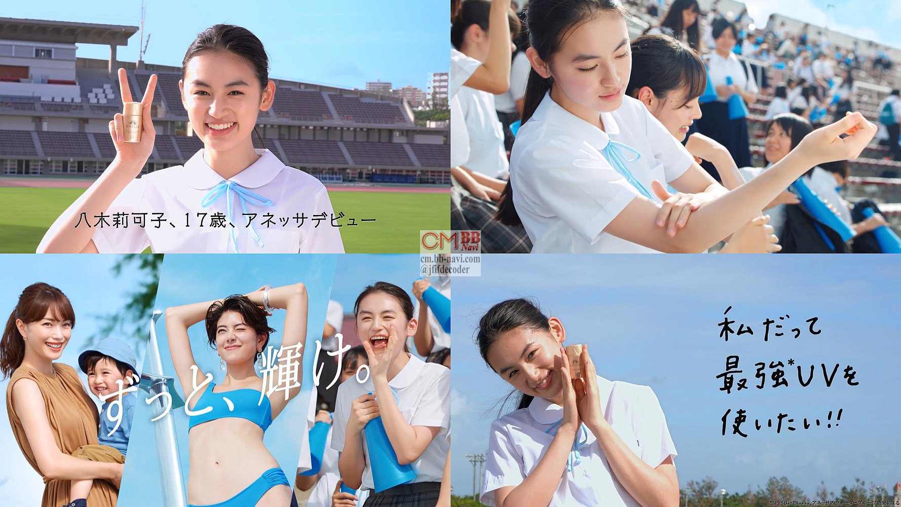 応援する女子高生役の八木莉可子さんが「私はミニ。絶対焼きたく無い日はアネッサと一緒」と登場し、「私達のアネッサ」と言うCM。こちらは冒頭で八木莉可子さんが「私だって最強UVを使いたい」と言います。
