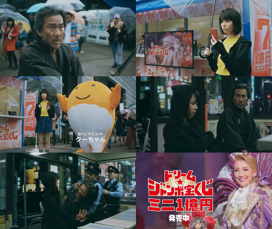 後半はタイムスリップして現代にやってきた侍役の俳優の役所広司さんが警察で「名前は?」と聞かれ、島崎遥香さんが「この人さ、タイムスリップだよきっと」と言うと、役所広司さんが「くノ一か」「おぬし、忍びか」と襟を締め上げるので、「やめてよ」と手をねじ曲げる、宝くじドリームジャンボのCMです。