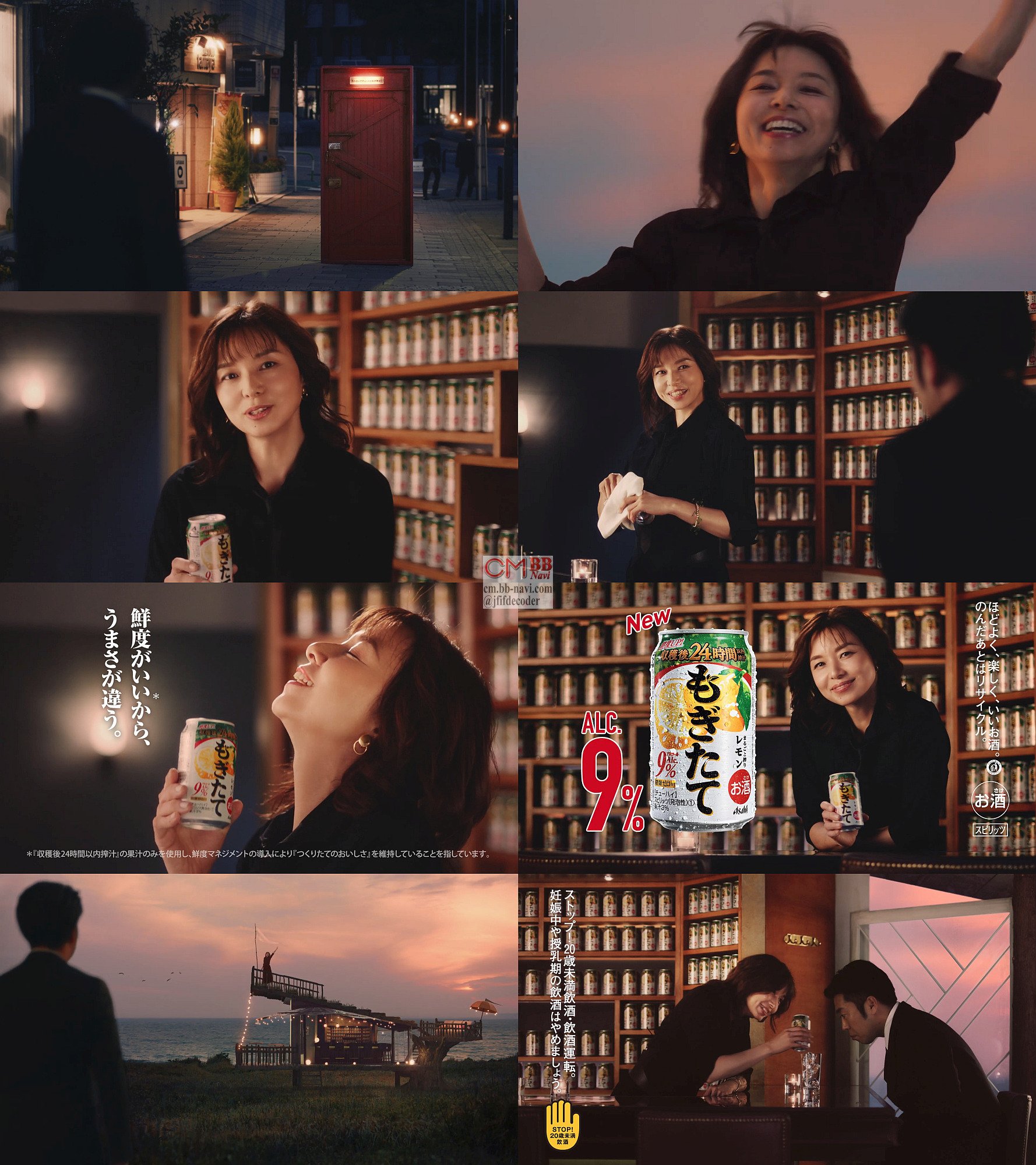 男性が夜の飲み屋界隈の路上にある「ストロングチューハイ好き限定」とある不思議なドアを「なんだ?」と開けると、ドラえもんのどこでもドアのように、なぜか海辺へと場面が変わり、黒のワンピース姿のバーテン役の女優の山口智子さんが「ハイ、ストロングチューハイ好き」と手を大きく振って出迎え、バーのカウンターで「書いてあるよ、顔に」と顔に”ストロングチューハイ大好き大好き”と書いてある事を指摘され、続けて山口智子さんが「知ってる?チューハイのおいしさって、レモンの鮮度で全然違うの」と言いながら、缶チューハイをおいしそうに飲み、最後に「試してもぎたて」とポーズします。