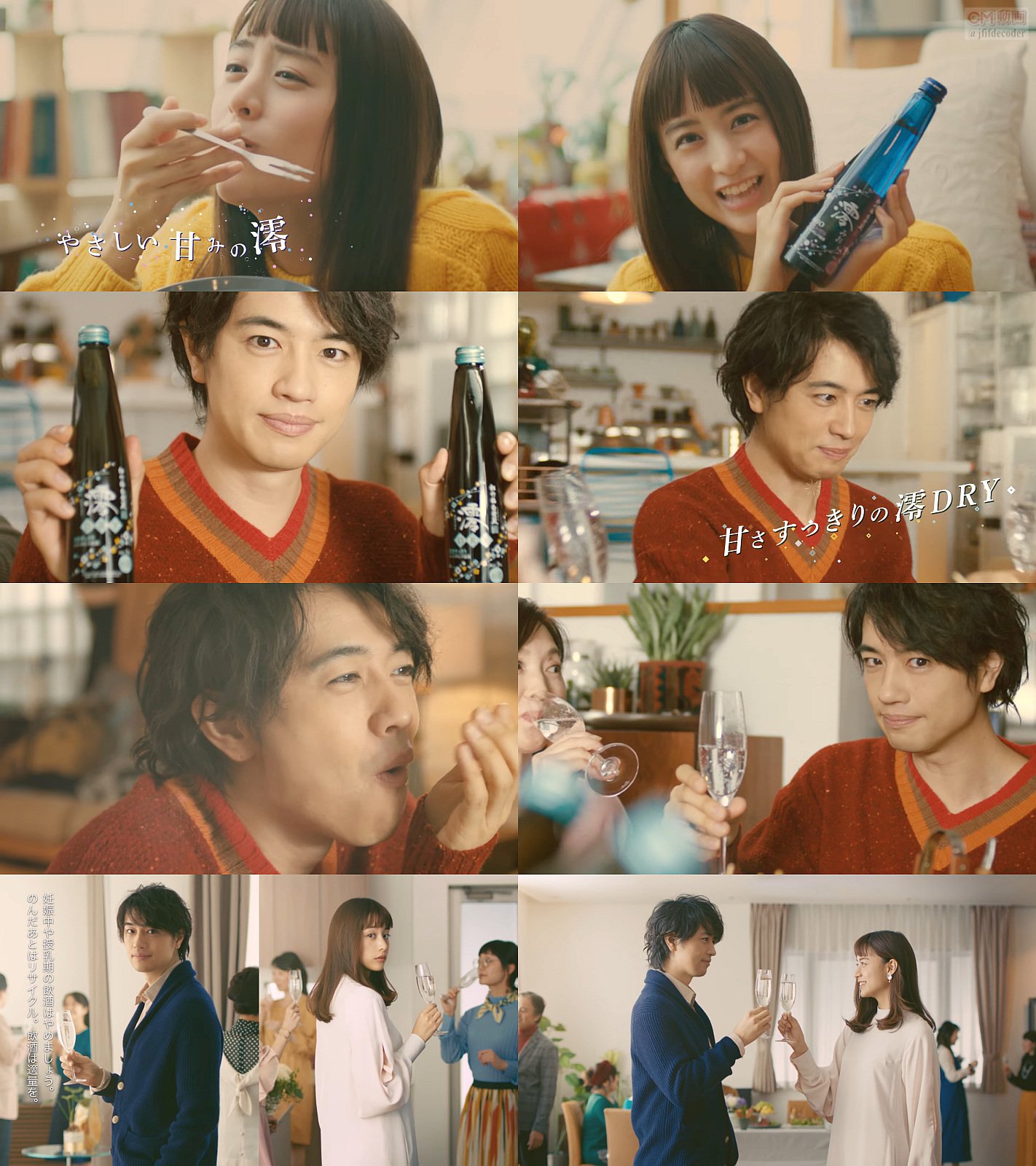 黄色系のセーターを着た女優の山本美月さんが女友達と、チーズフォンデュと澪(みお)でパーティーする澪パーして「澪パー」を連呼し、Vネックのセーターを着た俳優の斎藤工さんがおでんと澪ドライでパーティーする、澪パーして「澪パ」を連呼し、最後に二人が出会って、「やっぱり」「澪パですね」と言う、松竹梅白壁蔵 澪(みお)のCMです。
