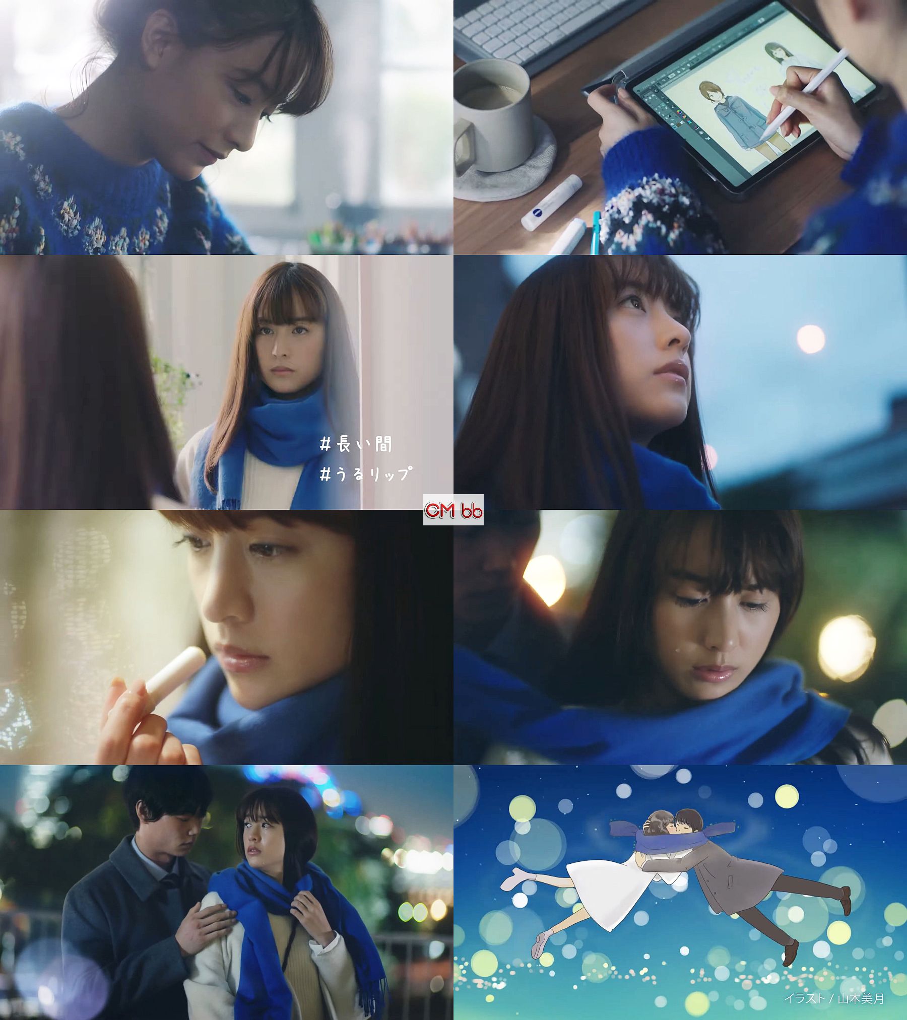 待ち合わせ場所に彼氏が来ず、海を見ている彼女役の山本美月さんに、彼氏が青いマフラーを手に「ごめん」と現れ「うるおい続く、二人をつなぐ」と語る、ニベア花王 ニベアリップ ディープモイスチャーのCM 30秒版。