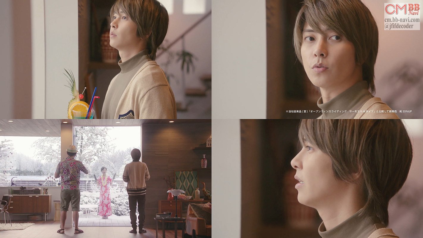 俳優の山下智久さんが先輩役のピエール瀧さんのお宅を冬を訪問し庭を見ながらカクテルを手に「そう言えば冬なのに、随分薄着ですね?」と聞くと、窓が明るく断熱性が高いので夏と勘違いしてると答え、窓の向こうに雪の降り積もる庭に、高橋秀樹さんの娘のフリーアナウンサーの妻役の高橋真麻さんが登場し、ハワイアン風の衣装で「まーず窓♪まーず窓♪」と歌うので、「奥さん… 寒くないんですか?」「中入って下さい」と話しかける、リクシル TOSTEM(トステム)のCM 30秒版です。