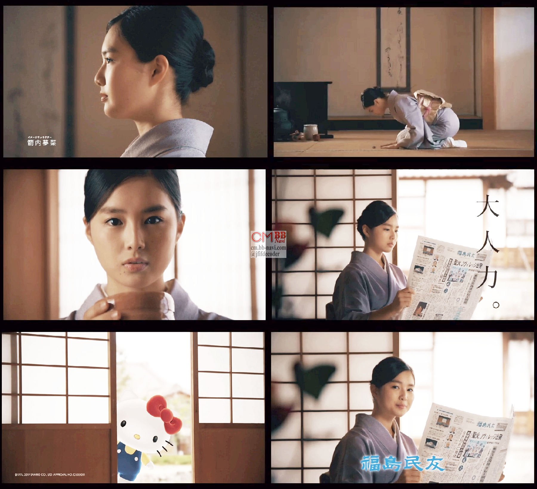 モデルの箭内夢菜さんが和服姿で和室で礼をしてお茶を飲み「深い。深く知りたい」と語り、新聞を読んでるとキティちゃん(?)が「大人になったなぁ」「知識は人を育てる。福島民友」と語る、福島民友新聞のCMです。