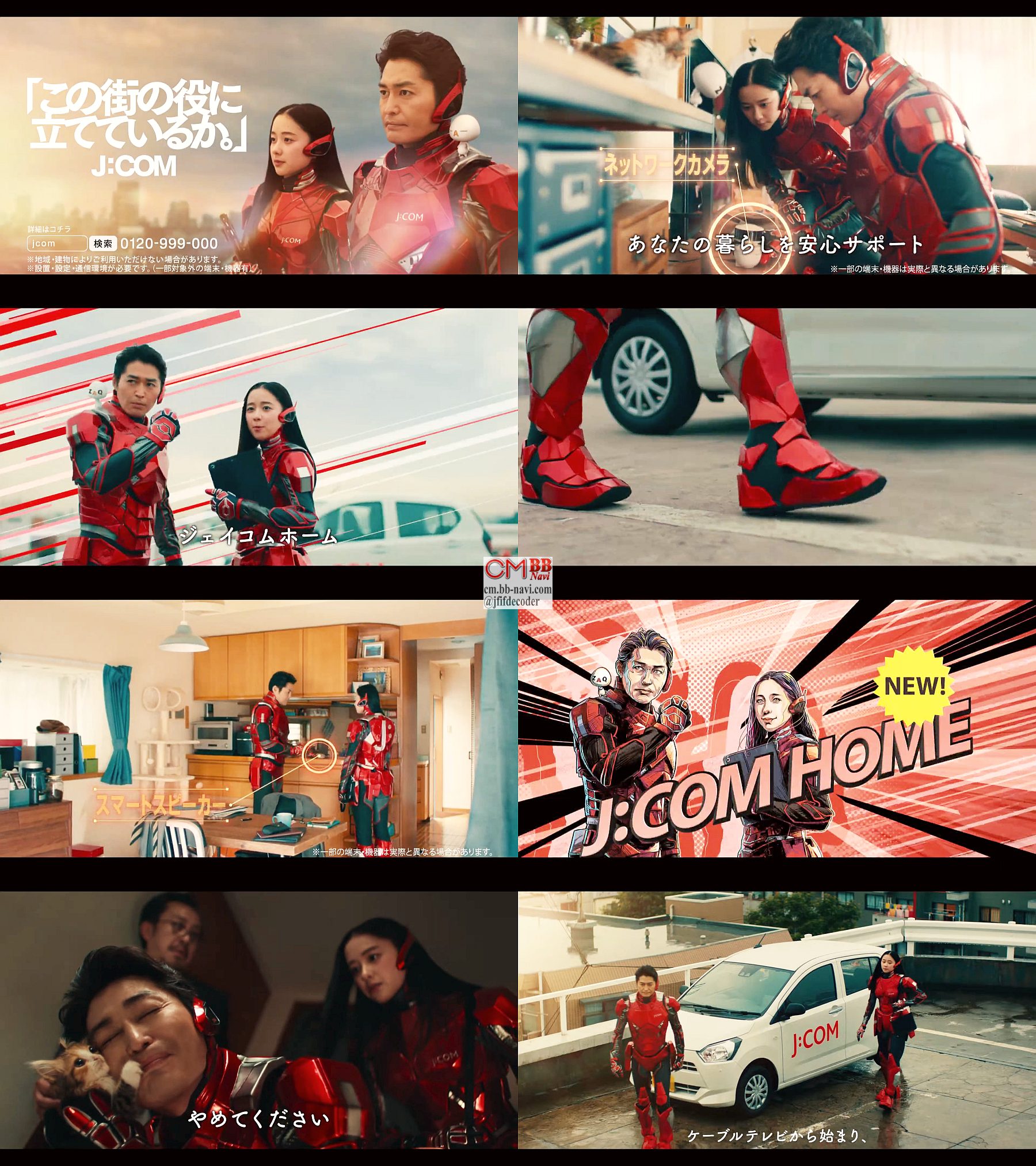 仕事中に家のペットの事が心配な男性の元へ、アイアンマン風の赤いメタリックなボディスーツを着た、俳優の安田顕さんと、女優の堀田真由さんが、「そんな時こそ、ジェイコムホーム」とジェイコムの車で駆け付けジェイコムの見守りに関するネットワークサービスで解決し、最後に「この街の役に立てているか」と言いいます。
