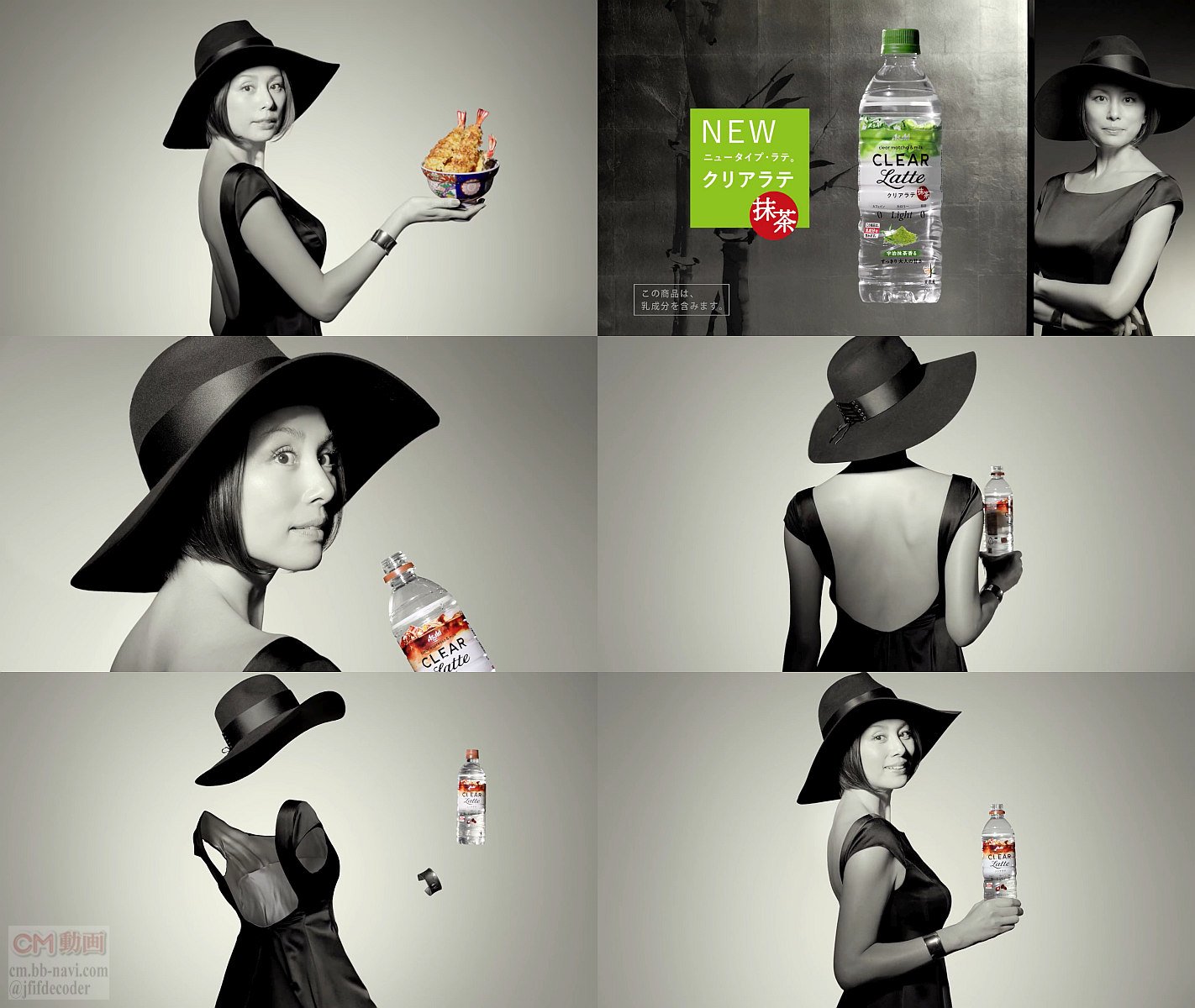 背中の大きく開いた大胆なカッティングのドレスを着た女優の米倉涼子さんが全部透けて見えてしまうクリア人間になり、クリアラテを一口飲むと「あ」と体が見えてしまい「いろいろ余分だったんだ。」と語り、最後に「抹茶もクリア」と言うモノクロのアサヒ クリアラテ抹茶のCMです。