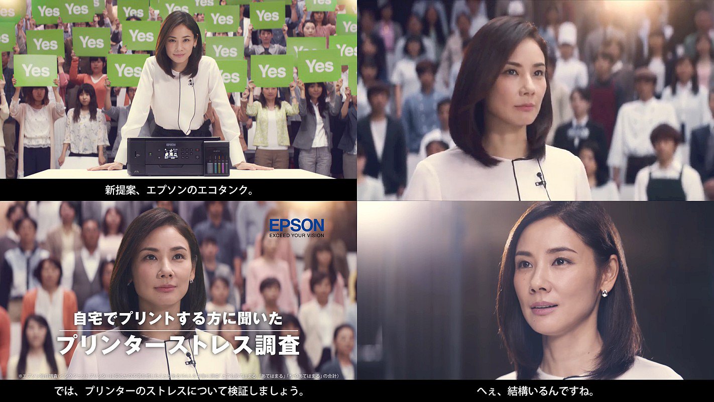 会場に現れた女優の吉田羊さんが、「インクはしょっちゅう切れる?」「しかも高い?」と、パネルを持った会場の人々にアンケートをし、「新提案、エコタンク」と言い皆が”Yes”のパネルを持ち、インク1年分のエコタンクの紹介がされる、エプソンのCMです。