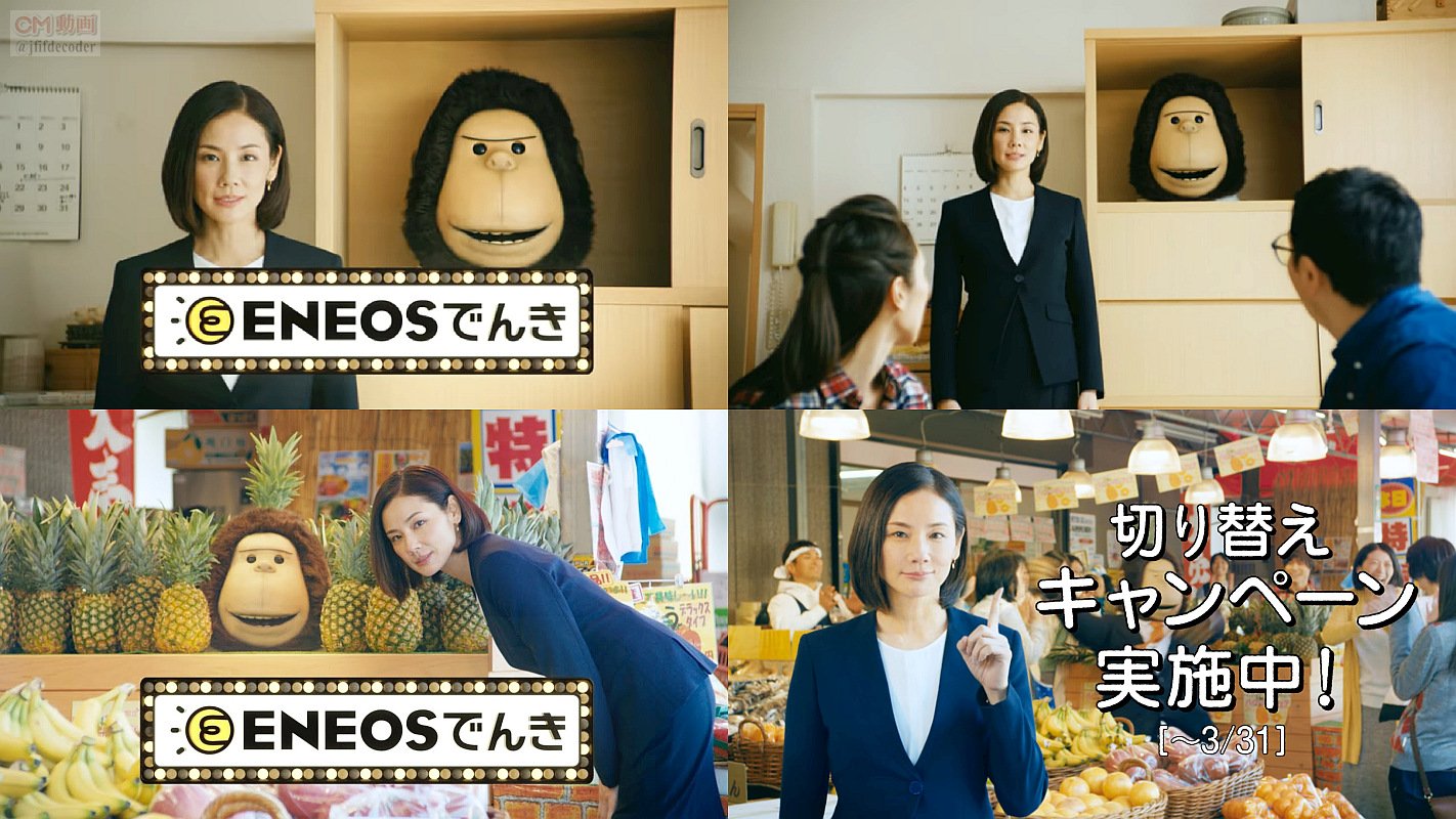 電気を切り替えたい、電気をどこにしようか迷ってる人の所へ、スーツ姿の女優の吉田羊さんが現れ「と、思ったら、この顔を思い出して下さい。ENEOSでんきです」と、エネゴリ君が顔だけ登場して「ウホウホ」する、ENEOSでんきのCMです。