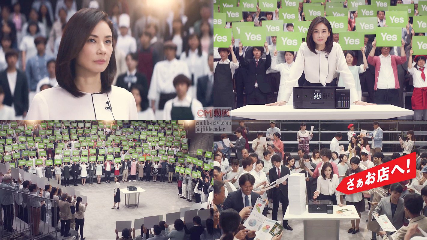 会場に現れた女優の吉田羊さんが、「インクはしょっちゅう切れる?」「しかも高い?」と、パネルを持った会場の人々にアンケートをし、「新提案、エコタンク」と言い皆が”Yes”のパネルを持ち、インク1年分のエコタンクの紹介がされる、エプソンのCMです。