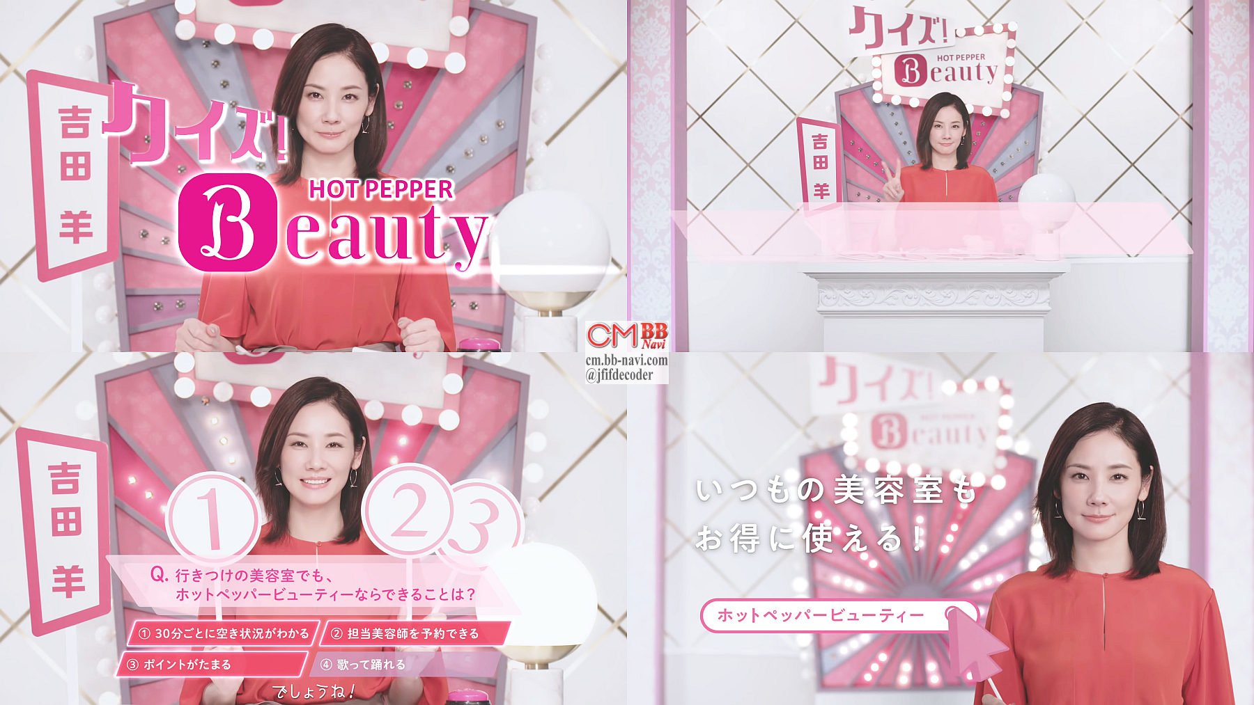 女優の吉田羊さんが、クイズ ホットペッパービューティーの仮想のクイズ番組で「行きつけの美容室でもホットペッパービューティーならできることは?」と質問され大正解するWeb CM 30秒版です。