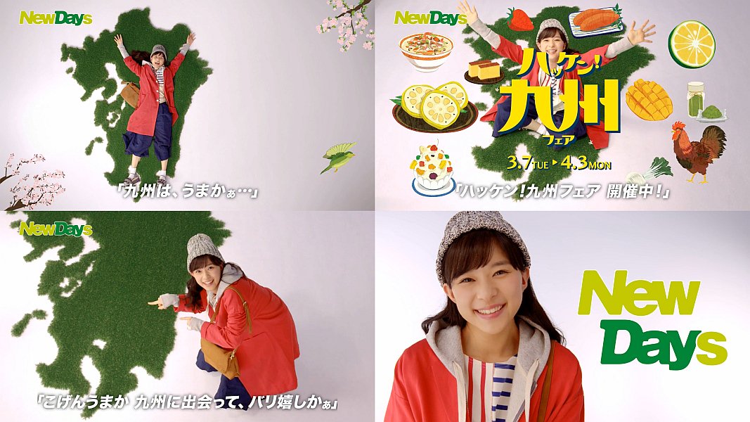 ニット帽をかぶった女優の芳根京子さんが「九州は… うまかぁ」と九州の上をゴロゴロしながら登場して、九州フェアを紹介し、九州を指さしながら「こげんうまか九州に出会って、バリ嬉しかぁ」と言う、ニューデイズのCMです。