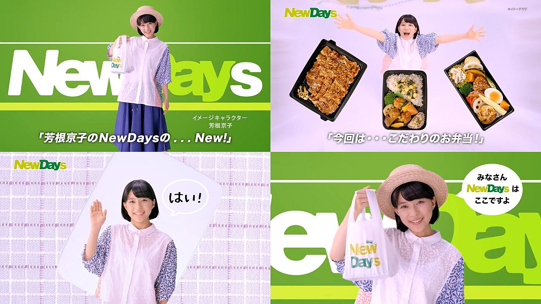 カンカン帽の女優の芳根京子さんが「芳根京子の、NewDaysのNew」と登場し、ニューデイズの管理栄養士監修の週替わり弁当を紹介するCMです。