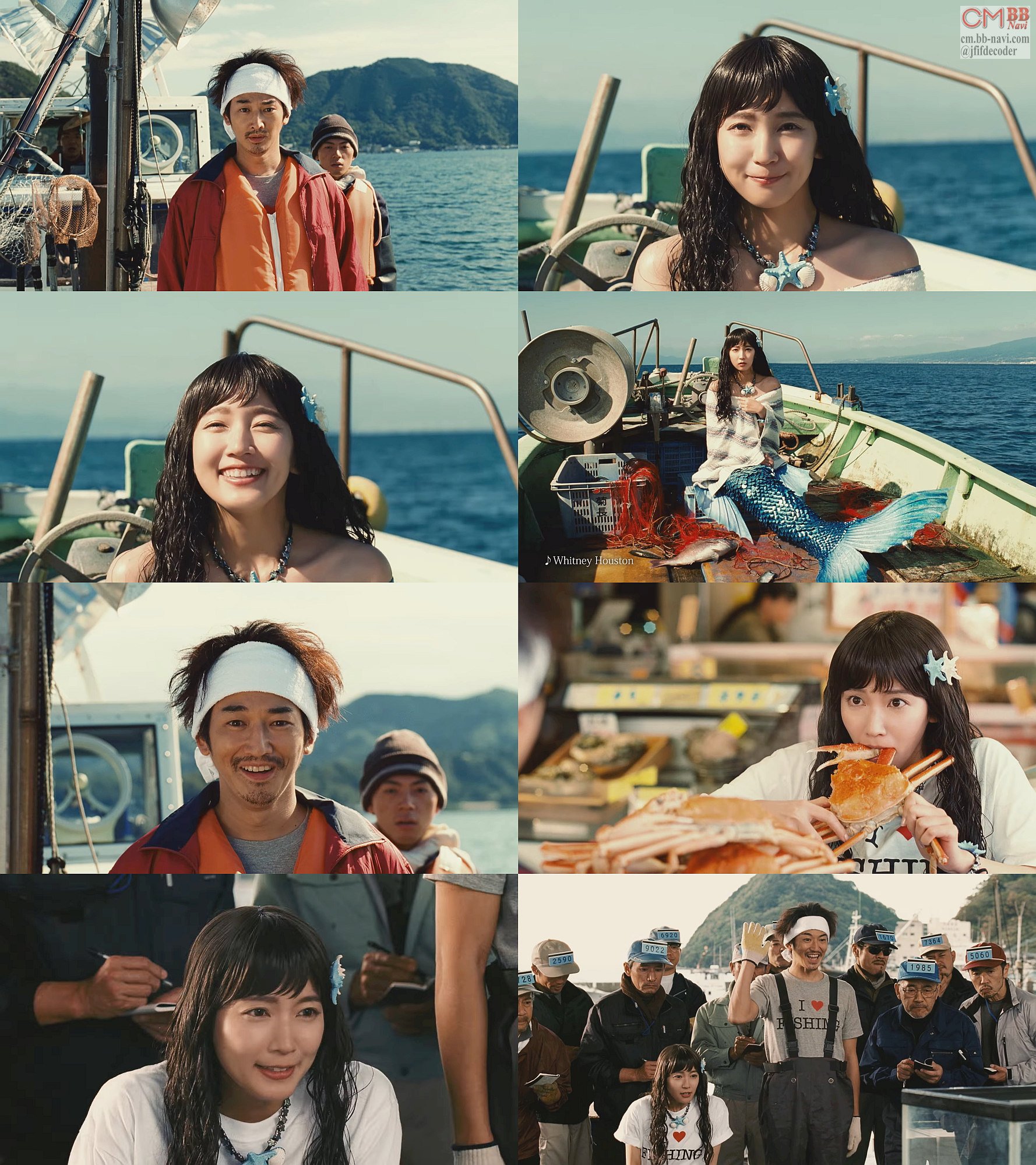 前半は、漁師になった俳優の瑛太さんが海の漁で吉岡里帆さん演じる人魚がかかってしまって「どうしよう。人魚がかかってしまった。しかもかわいい」と微笑むと、人魚の吉岡里帆さんが「お腹減った」とキュートな笑顔で言うので、市場にリアカーで連れていくと増量中のカニを指さし、皿に大盛のカニに人魚の吉岡里帆さんがワイルドにかぶりつくワイモバイルのCMです。
