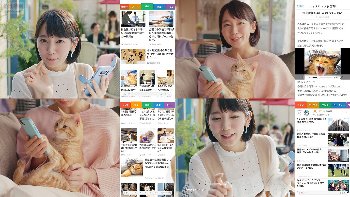 吉岡里帆さんが猫を抱いて「我々ねこ達のかわいいニュースが沢山届くんだにゃ」と猫の心の声?を代弁する、スマートニュースのCMです。