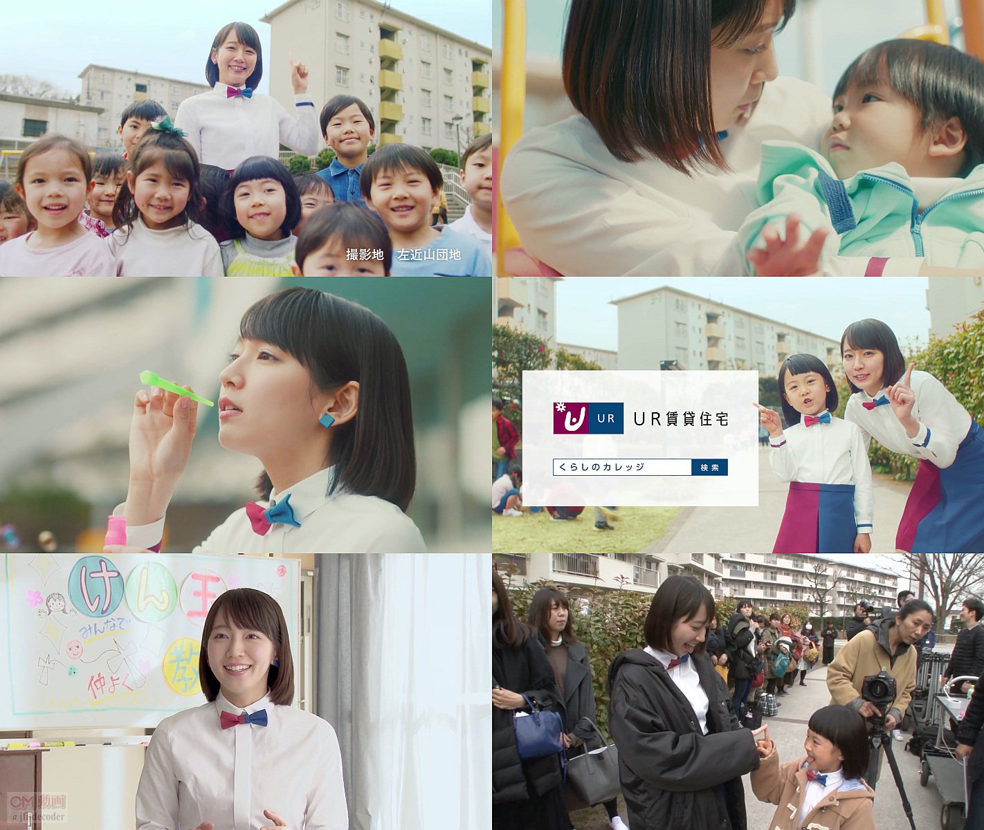 「こちらが子育て家族にオススメのURであーる。」と登場した、右と左で色が違う衣装と蝶ネクタイのいつもの衣装の女優の吉岡里帆さんが、神奈川県横浜市旭区の左近山団地の公園や集会所と子供達や住民と一緒に遊び、シャボン玉を飛ばして昔を思い出してると、吉岡里帆さんの少女の頃の役のミニURであーるガールが登場し「うん。楽しかったのであーる」「ウフフ」と笑うCMです。