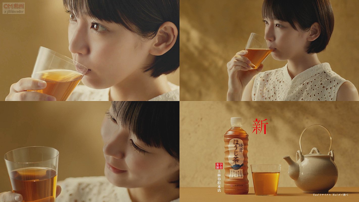 (メーテルの声などで有名な)声優の池田昌子さんのナレーションで、「綾鷹がほうじ茶を作るとこうなる。急須でいれたようなかすかなにごり」と語り、女優の吉岡里帆さんが綾鷹ほうじ茶を一口飲んで「香ばしい」もう一口飲んで「好きかも」と微笑むCMです。
