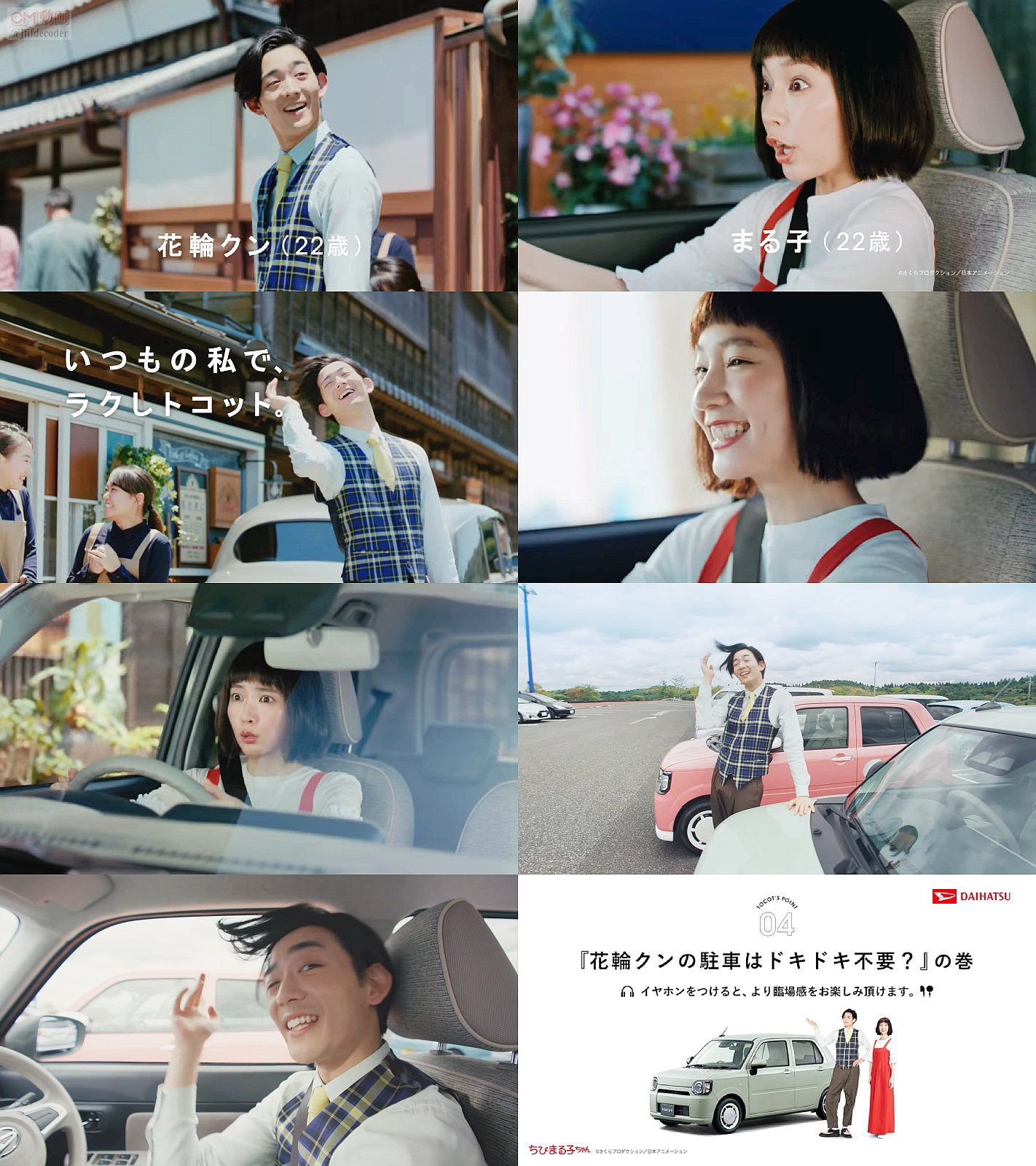 22歳の大人になったまる子(ちびまる子)役の吉岡里帆さんの車を、「ベイビー」「ブラボー」を連発する花輪君役の俳優の竜星涼さんが運転して駐車場に車を止めるのに四苦八苦してるのをトコットのパノラマモニターを使ってブラボーに停車する、ウェブ限定CM。