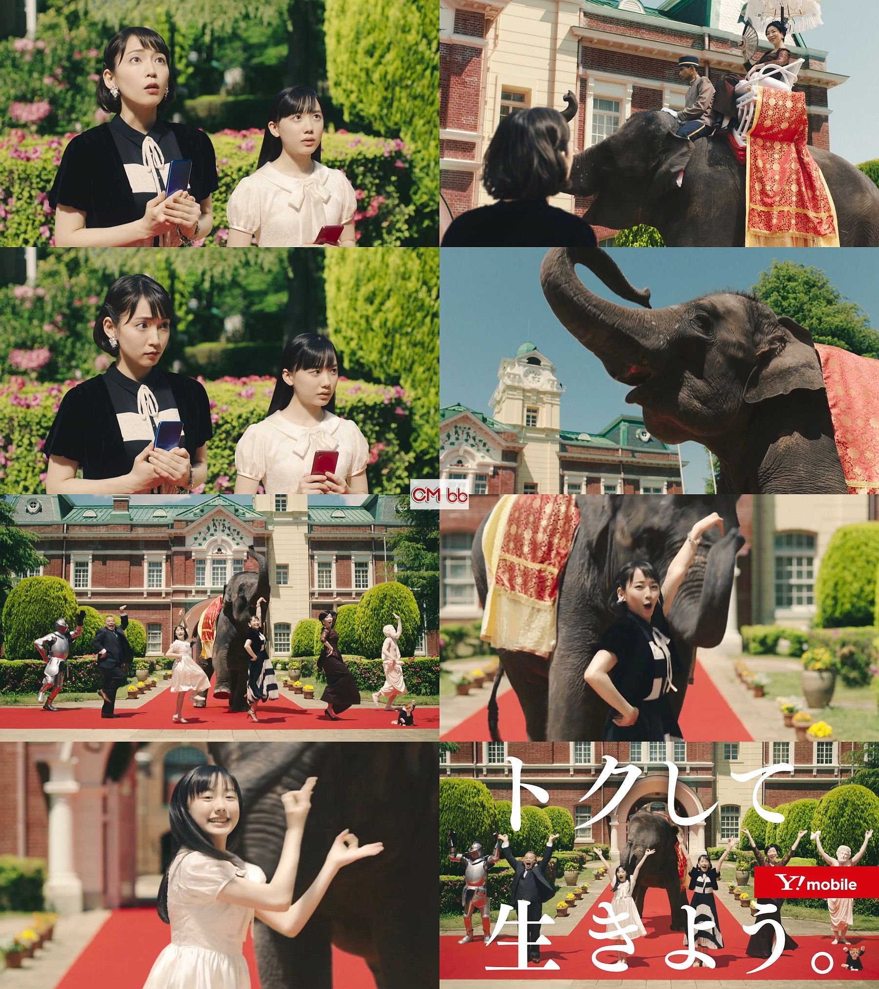 御得家の姉妹の吉岡里帆さんと芦田愛菜さんが、ママ役の真矢ミキさんが像に乗って「ペットよ」と登場し、,パパ役の出川哲朗さんが「そう、なんと、増量さ〜♪」と登場し、全員で「ワイワイワイモバー♪ 増量♪容量ギガが増量♪」と歌って、象の鼻のようにパォーンと腕を上げて踊って、象も長い鼻を揺らせて豪快に踊り出します。
