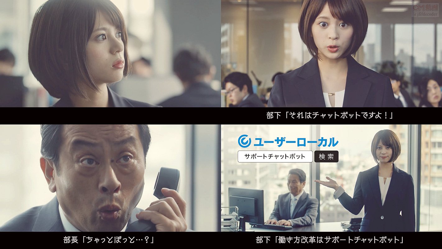 会社の部長役の金田明夫さんが、パスワードがわからなくなったり、経費申請のやり方がわからなくなって、社内電話で聞いてやりとりしているのを、女性社員のOL役の吉崎綾さんが「部長、それはチャットボットですよ」と進言し、最後に「働き方改革はサポートチャットボット」と言うCMです。