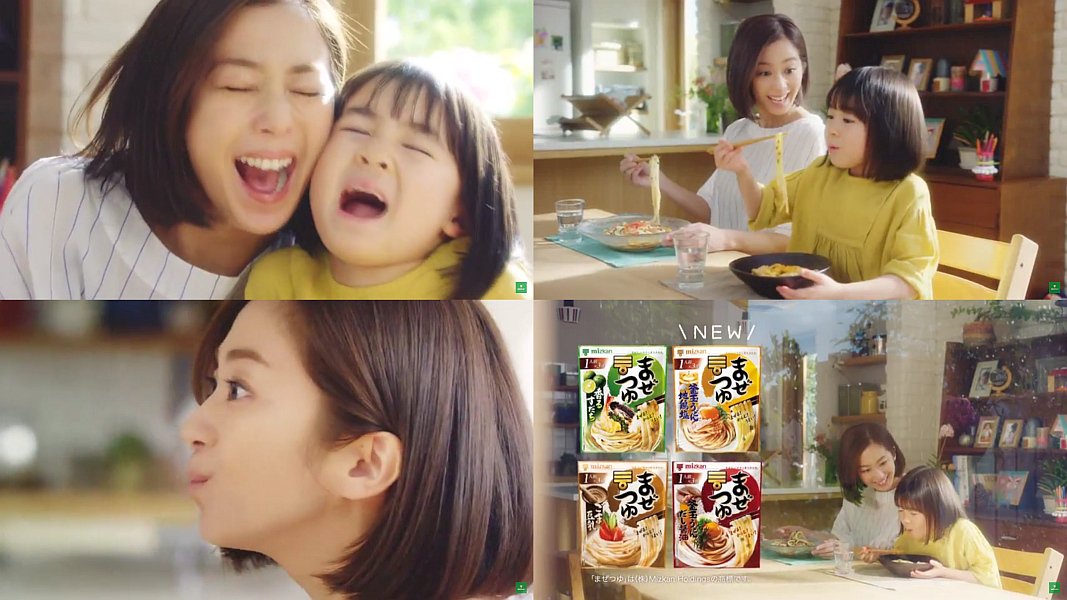 女優の優香さんが、幼い娘役の女の子と、冷蔵庫に発見した、大根と卵を使って、まぜつゆで、うどんをまぜまぜして、食べる、ミツカンまぜつゆのCMです。
