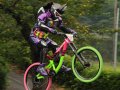 マウンテンバイクで宙を飛ぶ、黒の仮面ライダー 仮面ライダーゲンムのショット。